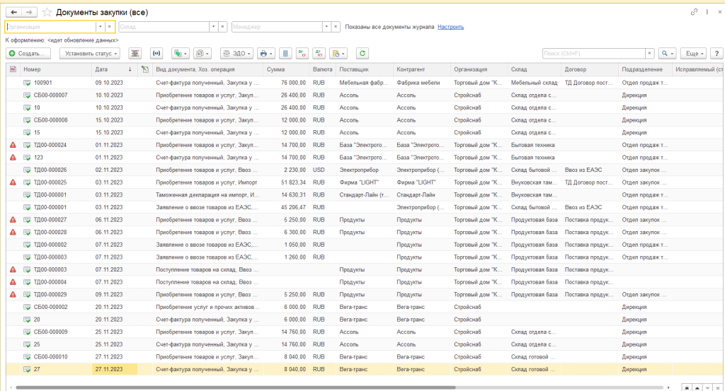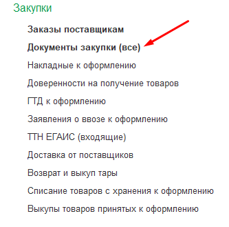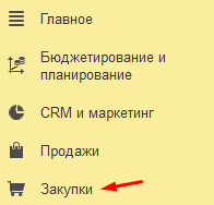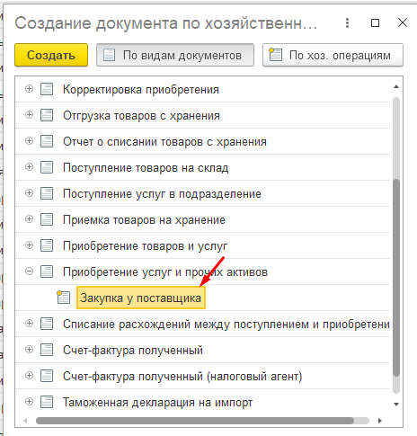 В списке документов нам нужно выбрать подменю «Приобретение услуг и прочих активов» и в нём выбрать «Закупка у поставщика».