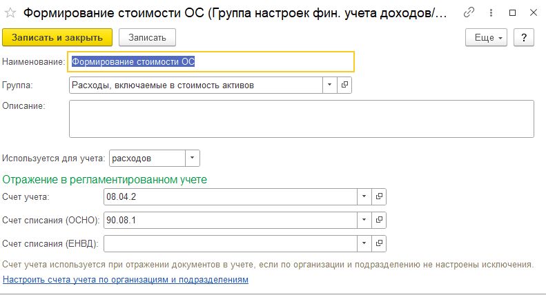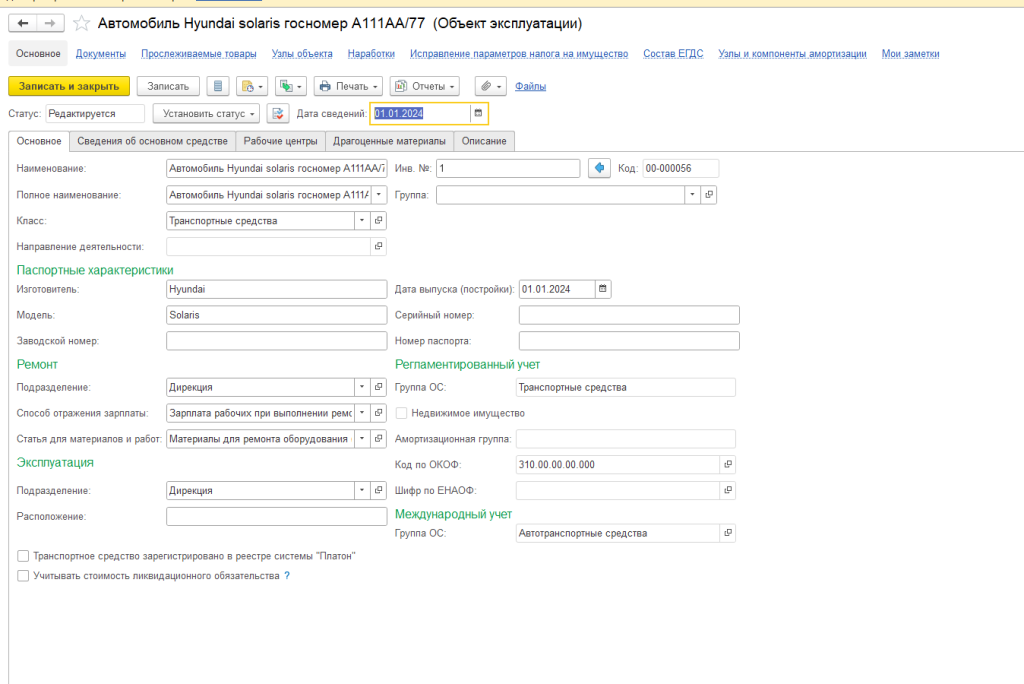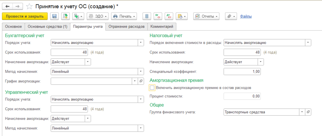 Настраиваем начисление амортизации и срок полезного использования для управленческого, бухгалтерского и налогового учёта. А также амортизационную премию и группу финансового учёта. Пример настроек на скриншоте.