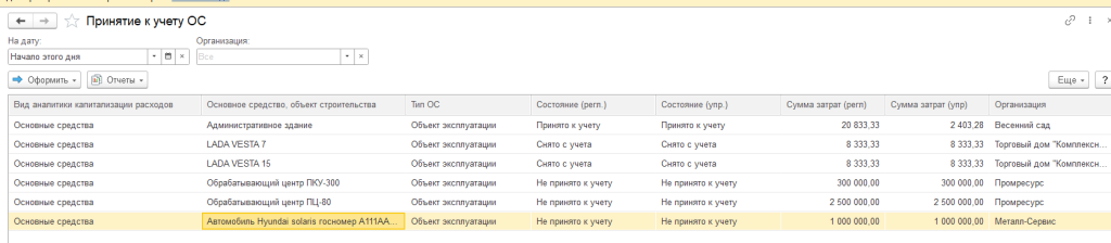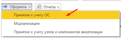Выделяем нужное основное средство и нажимаем «Оформить» и затем «Принятие к учету ОС».