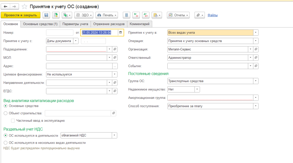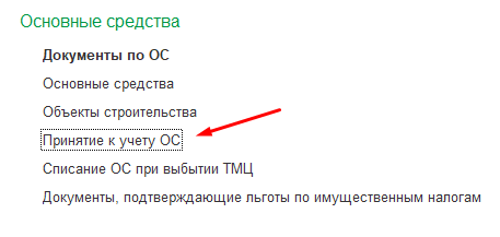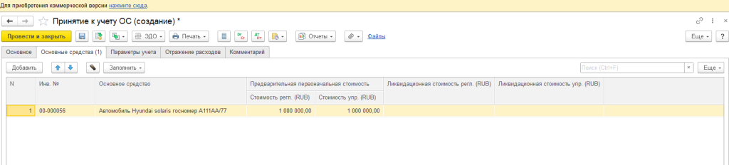 После этого откроется предварительно заполненный документ «Принятие ОС к учету».