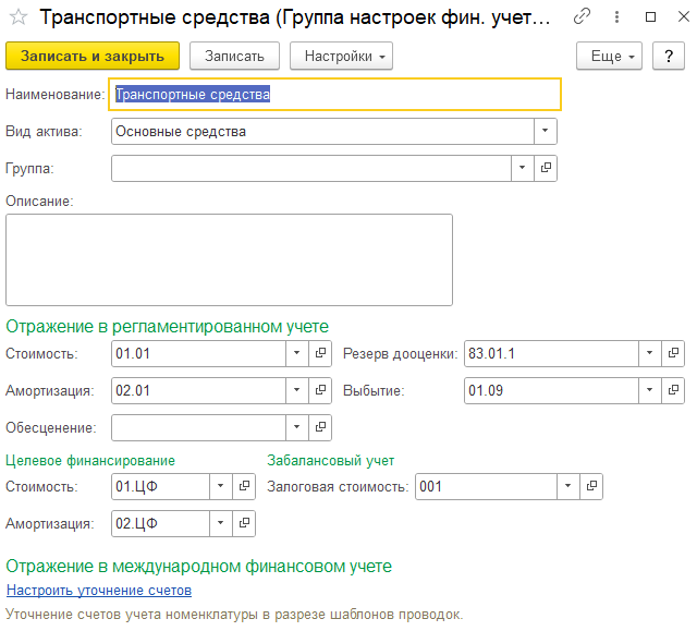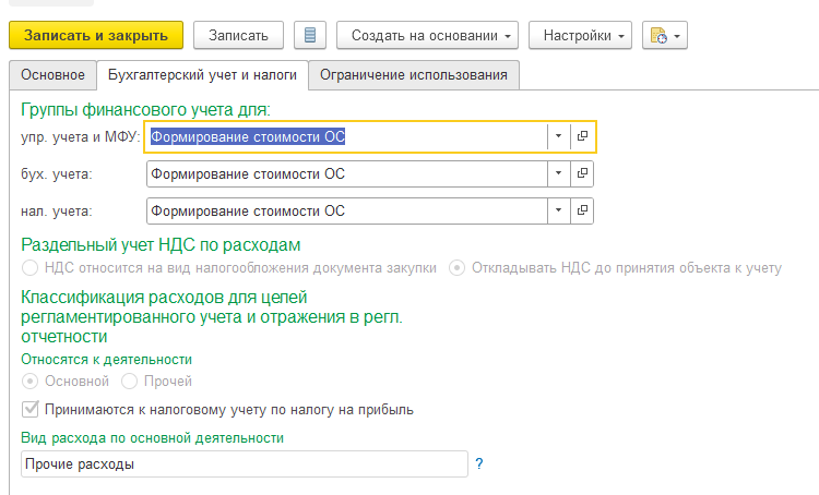 Группа финансового учёта расчётов по приобретению основного средства. Крайне советую создавать под приобретение основных средств отдельную группу финансового учёта, т.к. в ERP на ГФУ построена аналитика. |