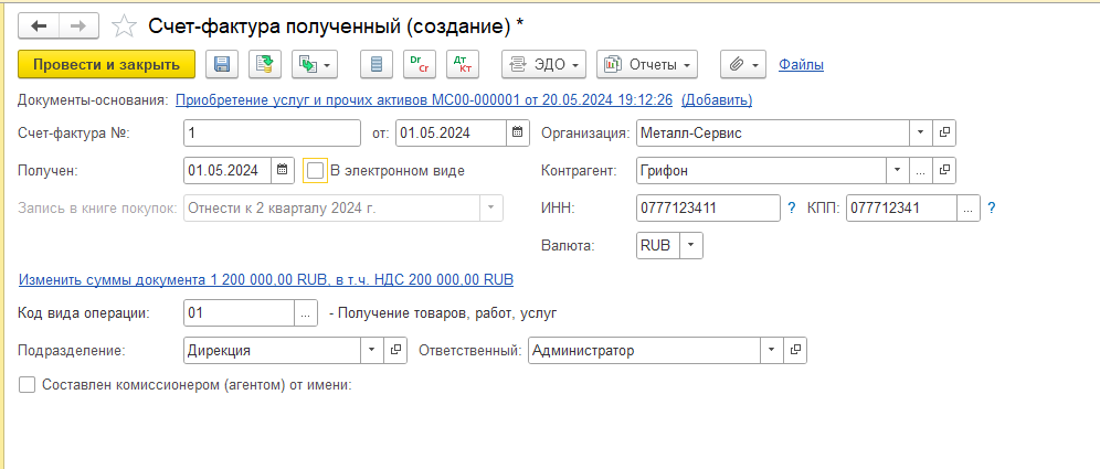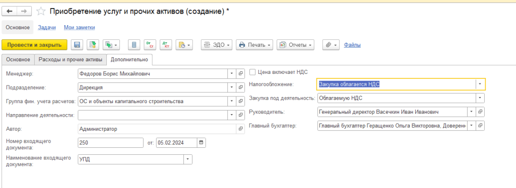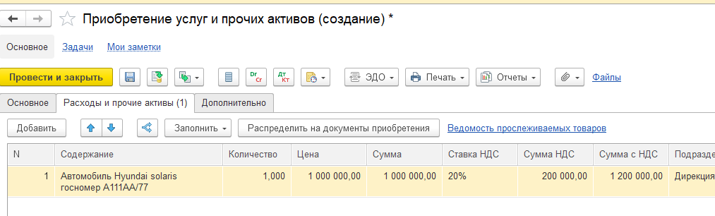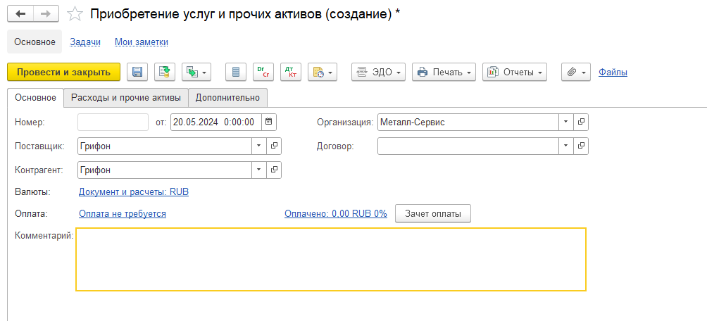 И нажать кнопку «Создать». Откроется форма документа приобретения услуг и прочих активов. Заполняем типовые вкладку «Основное».