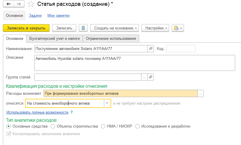 В графе «Расходы возникают» необходимо выбрать «При формировании внеоборотных активов», относятся «На стоимость внеоборотного актива» и тип аналитики «Основные средства».