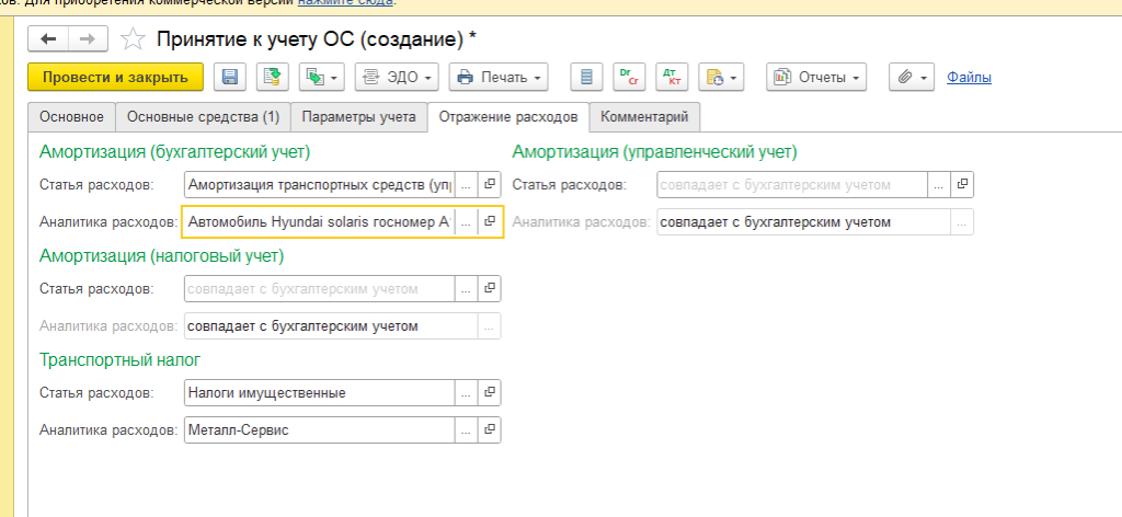 И заполняем статью расходов амортизации, аналитику статьи расходов. Если амортизация идёт одинаково в управленческом, бухгалтерском и налоговом учёте, то достаточно заполнить только бухгалтерский учёт (в УУ и НУ будет написано «совпадает с бухгалтерским учётом»)