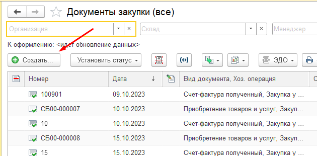 Не забываем ввести счёт фактуру для приходного документа по гиперссылке внизу документа.