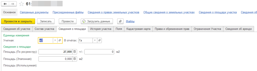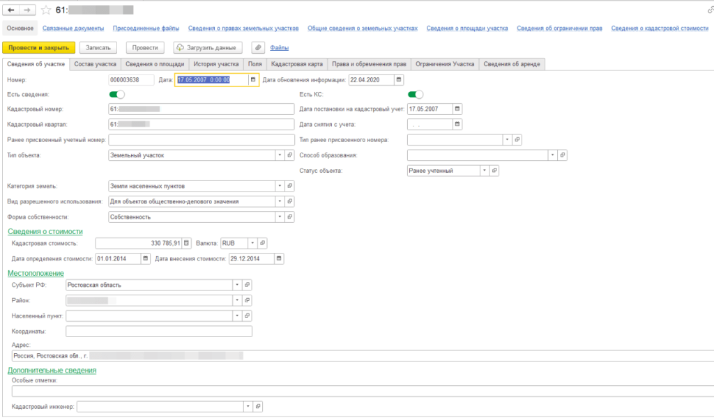 Подробная карточка земельного участка в 1С. Информация из Росреестра разнесена по разным вкладкам