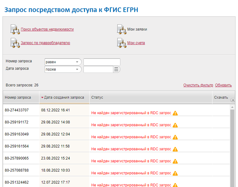 Перечень заказанных выписок в личном кабинете на сайте Росреества