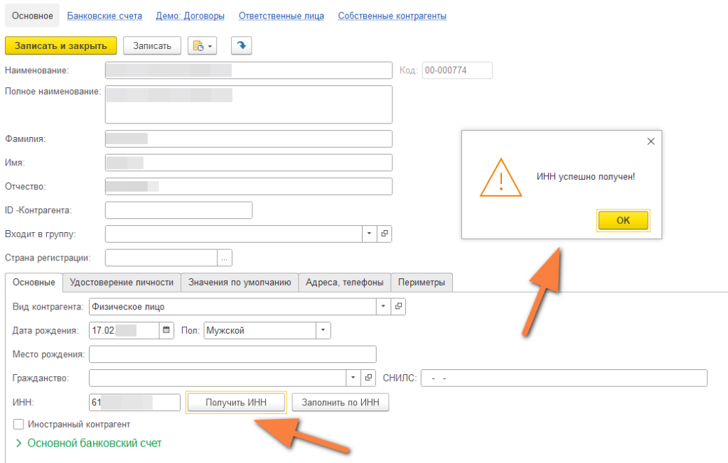 Бухгалтер нажимает кнопку «Получить ИНН», по API уходит запрос в ФНС и появляется окно, подтверждающее успешный результат