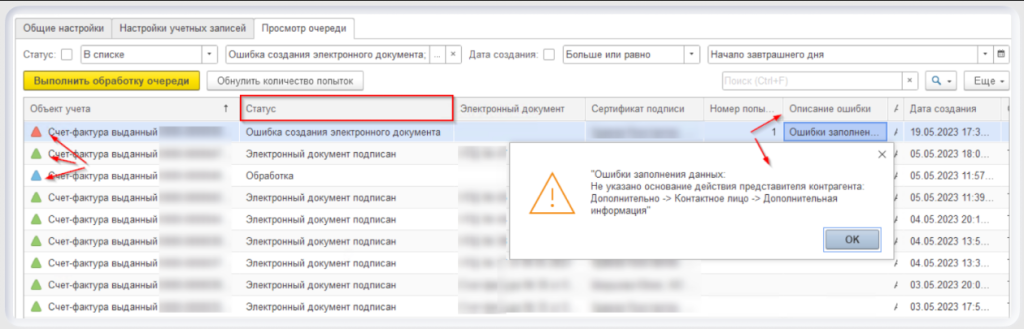 Регламентная задача с установленной периодичностью обходит очередь, пытаясь сформировать и подписать документ. В случае неудачи система присваивает записи статус ошибки и детальное описание проблемы — основной причиной служит некорректное заполнение учетных объектов. При успешном завершении запись получает пометку «Документ подписан».
