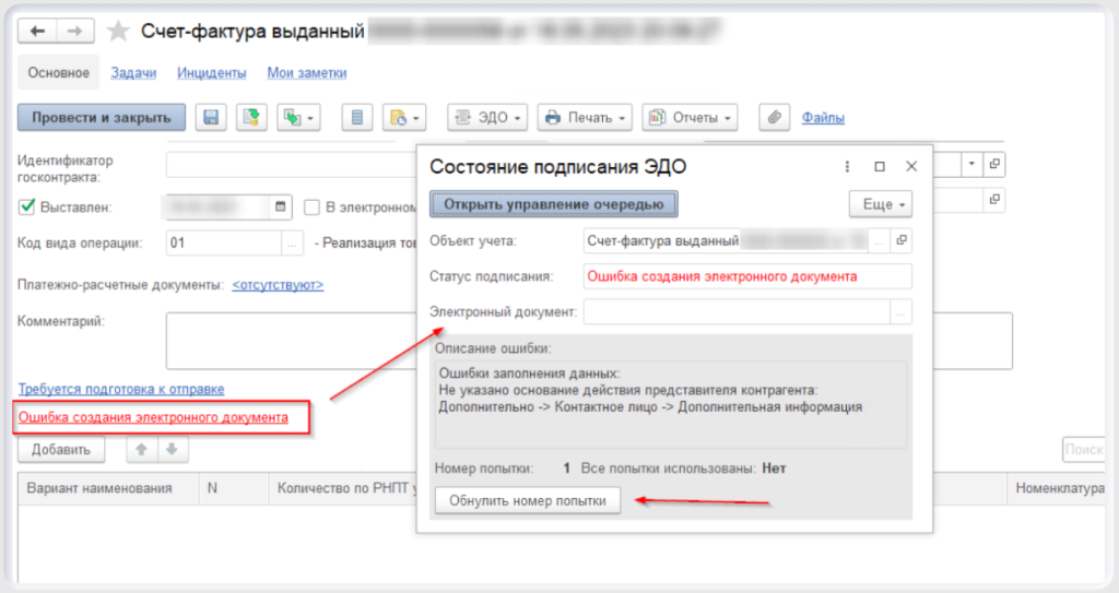 В формы учетных документов мы встроили декоративный элемент, отображающий текущий статус обработки электронного документа. Нажав на него, пользователь видит подробную информацию о подписании и при необходимости может сбросить счетчик попыток — это автоматически возвращает документ в очередь на повторную обработку. Благодаря этому любой сотрудник самостоятельно устраняет проблему прямо из формы документа, не привлекая системного администратора.