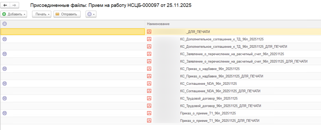 Мы полностью убрали лишние шаги: теперь при формировании комплекта документов в Комплексной автоматизации достаточно нажать одну кнопку — и все 7 файлов мгновенно уходят сотруднику на подпись. Как только он подписывает, готовые документы автоматически прикрепляются к карточке приема в базе. Все хранится в одном месте, ничего не теряется, а кадровик больше не тратит время на перекладывание файлов из папки в папку.