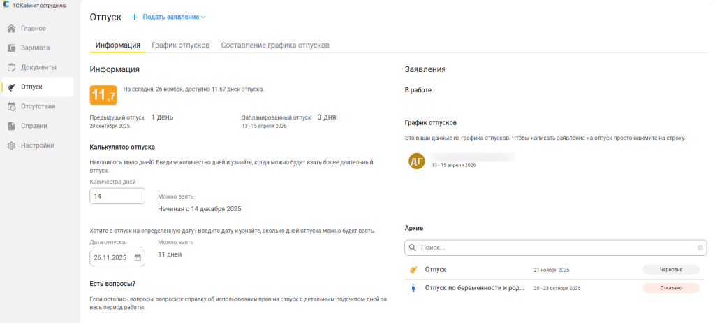 В 1С:Кабинете сотрудника все устроено иначе. Как только график отпусков утвержден и проведен в 1С:КА, он моментально появляется в личном кабинете каждого сотрудника и его руководителя. Человек заходит в сервис и сразу видит свои даты и остаток дней.