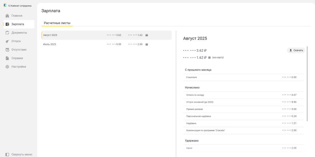 В 1С:Кабинет сотрудника расчетные листки приходят автоматически. В день выплаты листок появляется у сотрудника в разделе «Зарплата». Он заходит в удобное время, открывает файл, проверяет цифры и ставит электронную подпись прямо там же — подтверждая, что ознакомлен. Бухгалтеру больше не нужно ничего формировать, рассылать и контролировать доставку. Сотрудникам намного удобнее получать и подписывать листки в том же месте, где лежат все остальные документы. В любой момент можно зайти в раздел «Зарплата» и посмотреть листок за нужный месяц.