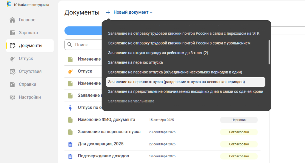 Вместе с консультантом по 1С:ЗУП мы создали полный набор собственных шаблонов, чтобы сотрудник мог подать любое заявление прямо из кабинета — без лишних звонков и писем кадровикам. Теперь в списке доступны: