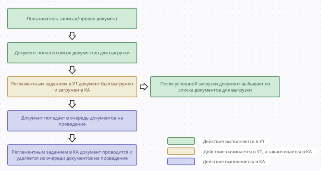- В базе КА развернули и опубликовали веб-сервис, принимающий входящий файл. После загрузки данных сервис отправляет подтверждение обратно в УТ. Она фиксирует успешный результат и снимает обработанные объекты с регистрации.