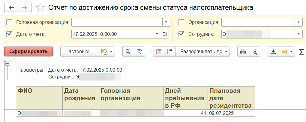Создали «Отчет по достижению срока смены статуса», который на заданную дату рассчитывает и отображает количество дней пребывания сотрудника в РФ. Документ также прогнозирует плановую дату достижения 183 дней, когда статус сменится на резидентский. Это дает специалистам время для проверки данных и подготовки к изменению ставки НДФЛ.