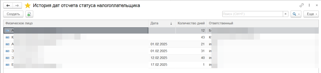Для отслеживания дней пребывания создали регистр сведений «История дат отсчета статуса налогоплательщика». Сотрудников в него добавляют вручную, указывая дату начала отсчета и количество дней, которые человек уже пробыл в РФ на этот момент. Это обеспечивает точный старт подсчета и учитывает прерывания, если работник покидал страну и вернулся.