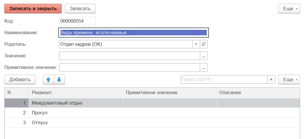 По просьбе заказчика создали дополнительный справочник для учета рабочего времени. В нем заказчик указывает периоды, когда сотрудник не работал: прогулы, отпуска, междувахтовый отдых. Сюда же заказчик может добавить дополнительные виды исключений, создав новый реквизит.