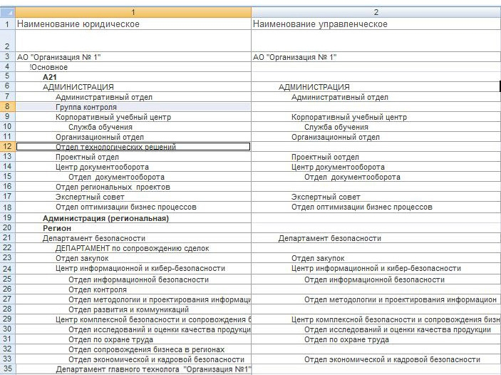 Параллельно с кадровой службой собрали в Excel-таблицу маппинг всех структур: в левых столбцах — как подразделения и должности выглядят юридически в каждой из семи баз, в правых — как они должны выглядеть фактически в новой единой управленческой иерархии. Эта таблица стала основой для всех последующих шагов и помогла избежать ошибок при объединении.