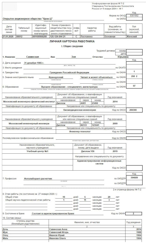Актуальные персональные данные в карточке Т-2: образование, знание языков, состав семьи, стаж — без ручного сбора из разных систем.