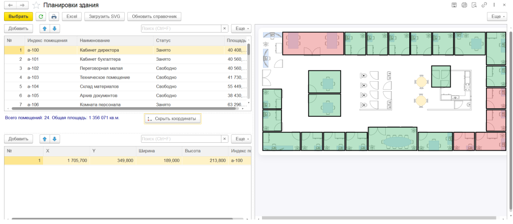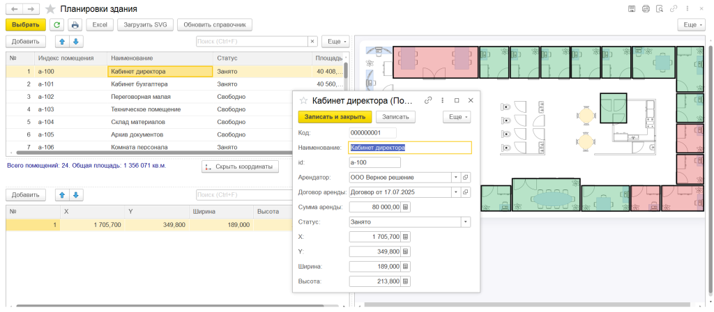Мы решили эту задачу. С нашей доработкой система автоматически читает план в формате SVG, определяет помещения по контурам и сопоставляет их с элементами справочника 1С. Если помещение существует, данные обновляются, если нет — создается новое. Это позволило отказаться от ручной работы, ускорило актуализацию планов и упростило подготовку визуальных схем для внутренних показов.