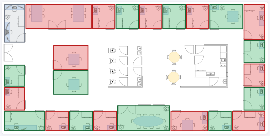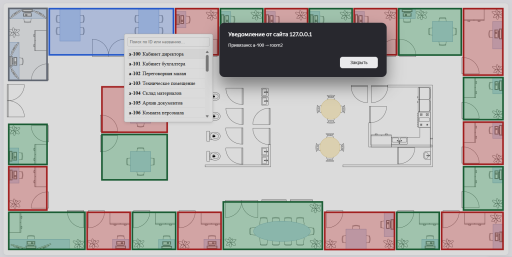 Теперь сотрудники видят все помещения на картах — по этажам, с интерактивной схемой. Раньше поиск по списку в базе отнимал время, а изменения планировок не были видны. После доработки данные обновляются сами, контрагенты привязываются одним кликом, а любые изменения синхронизируются с базой 1С мгновенно, исключая ошибки ручного ввода.