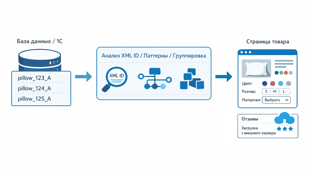 Мы внимательно изучили XML ID товаров, которые приходят из 1С. Оказалось, что у всех вариантов одного товара эта строка имеет общую часть: одинаковый цифровой префикс и буквенный суффикс. На основе этого мы построили точную маску поиска и с помощью регулярных выражений научились автоматически находить все родственные артикулы.