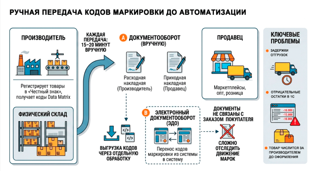 Пока все документы не оформлены, товар продолжал числиться за производителем, а не за продавцом — в учете возникали отрицательные остатки. На одну такую передачу уходило 15–20 минут, и это сильно тормозило отгрузки.