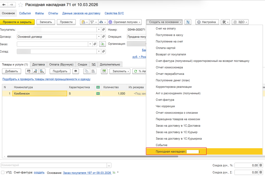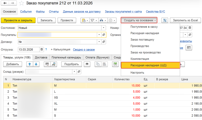При необходимости оператор создает заказ в производство или меняет статус расходной накладной, если товар уже есть в остатках. Если отгрузка идет частями — редактирует табличную часть.
