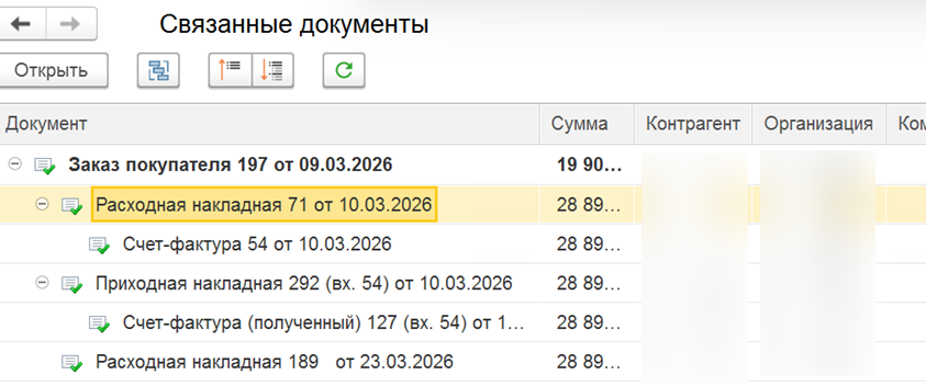 Поскольку включить типовой механизм интеркампани было нельзя, мы выбрали другой подход: сделали заказ покупателя единой точкой входа для всей цепочки. На его основании все документы создаются последовательно — расходная накладная от производителя, приходная на продавца, отгрузка конечному покупателю. Такая схема позволила обойти ограничения программы и закрыла все потребности.