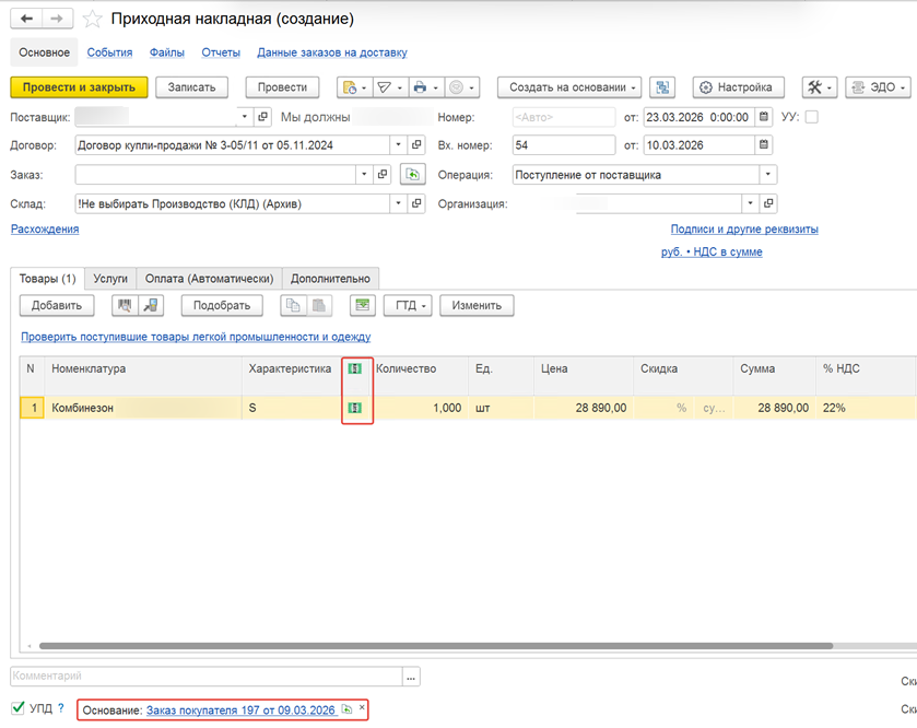 Коды маркировки автоматически подтягиваются в табличную часть приходной накладной — прямо из расходных документов производителя, без ручного ввода.