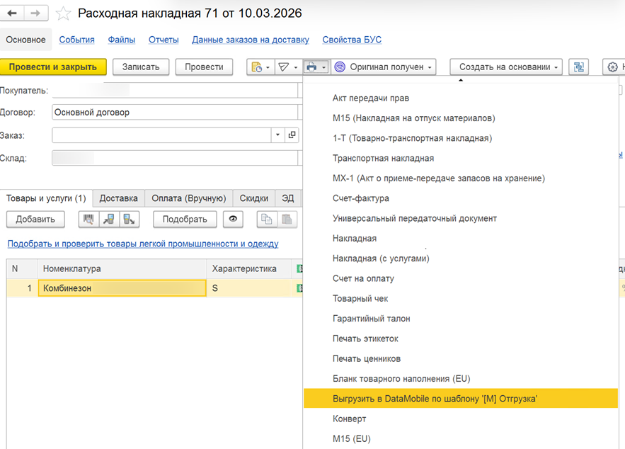 По отдельной кнопке на основании заказа формируется расходная накладная от организации-производителя — с заполненной табличной частью товаров и ценами по договору.