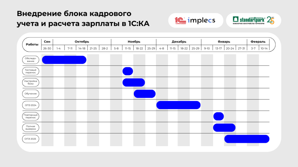 Со стороны implecs — 5 человек: руководитель проекта, ведущий аналитик по кадровому учету и расчету заработной платы, аналитик по кадровому учету и расчету заработной платы, технический писатель, разработчик.