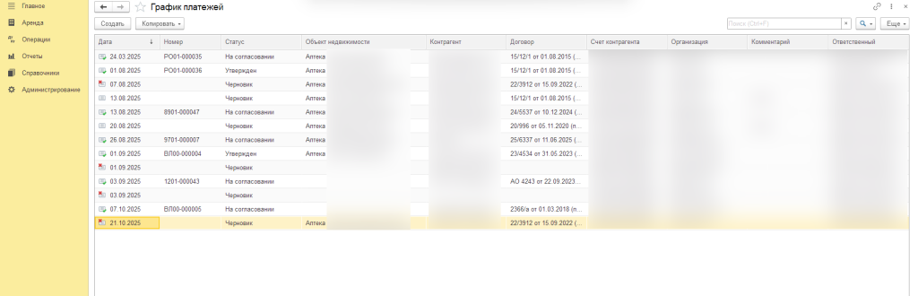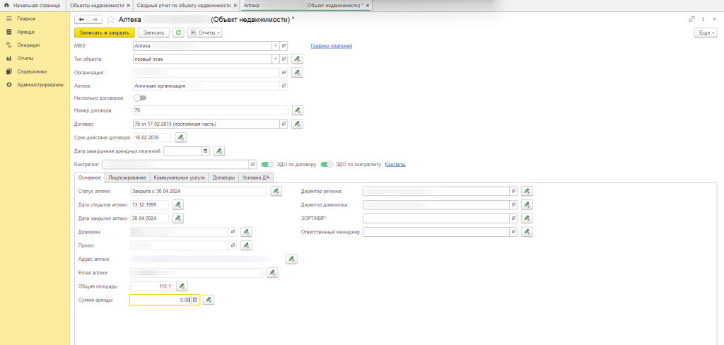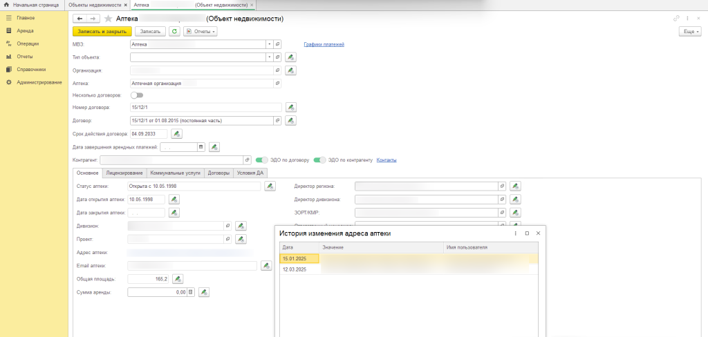 Аптечная сеть имеет обширный портфель арендованных помещений, с договорами аренды, оплатами коммунальных услуг и связанными задачами. Региональные менеджеры вели учет площадей в разрозненных системах: часть данных хранилась в Excel, часть — в 1С:Бухгалтерии, а часть — во внутренней программе. Это создавало сложности — информация была разбросана, требовала ручного сбора и перепроверки, а данные содержали неполные или неверные записи. Назрела необходимость консолидировать все в одном месте, чтобы менеджеры могли быстро и удобно работать, учитывать оплаты и поддерживать порядок в договорах.