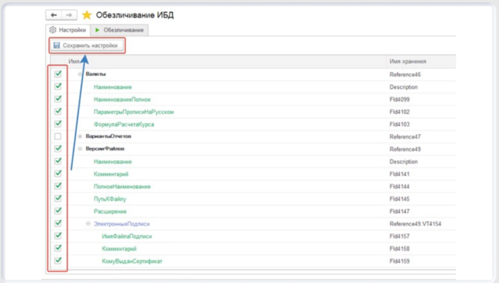 В тестовой базе, для которой выполняется процедура обезличивания, запускается обработка «Обезличивание ИБД». На вкладке «Настройки» специалист отмечает объекты, строковые реквизиты, табличные части и строковые реквизиты табличных частей, которые должны быть обезличены. Сформированный список сохраняется в файл кнопкой «Сохранить настройки» — для последующего использования.