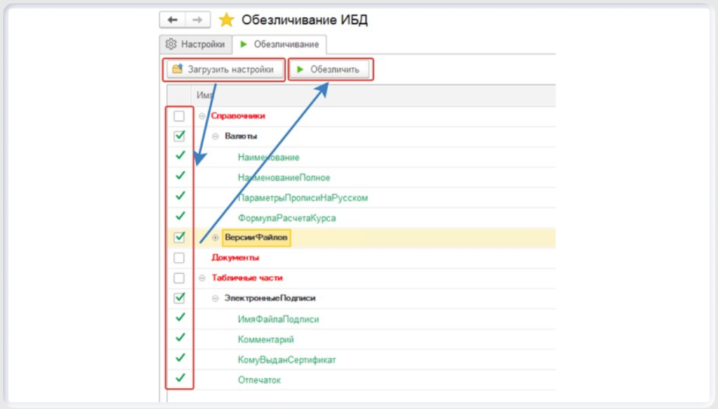 В основной базе также открывается обработка «Обезличивание ИБД». На вкладке «Обезличивание» через кнопку «Загрузить настройки» загружается ранее сохранённый список объектов и реквизитов. Затем из него выбираются те позиции, которые нужно обезличить в текущем сеансе, и нажимается кнопка «Обезличить».