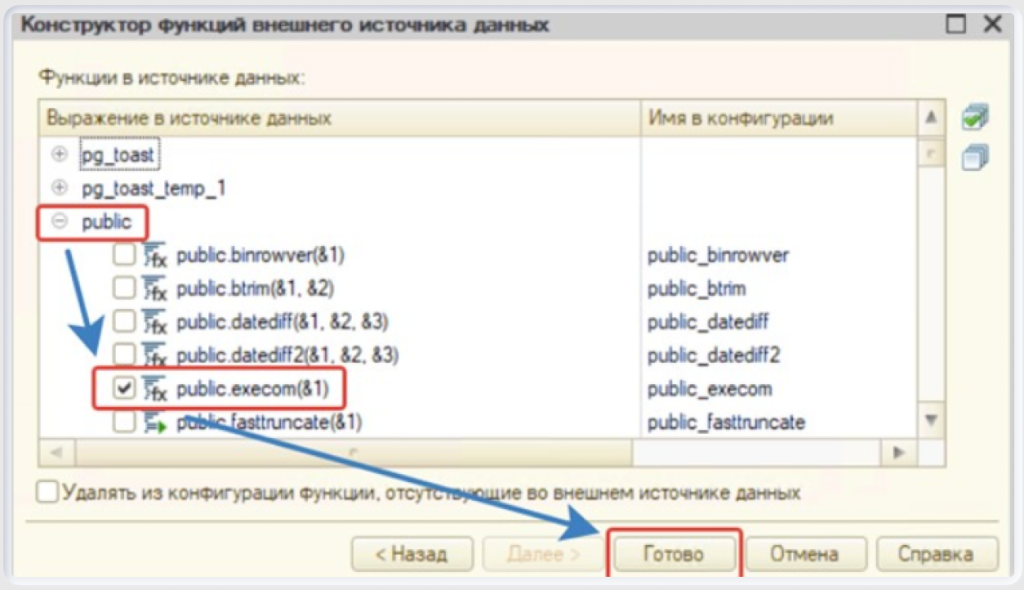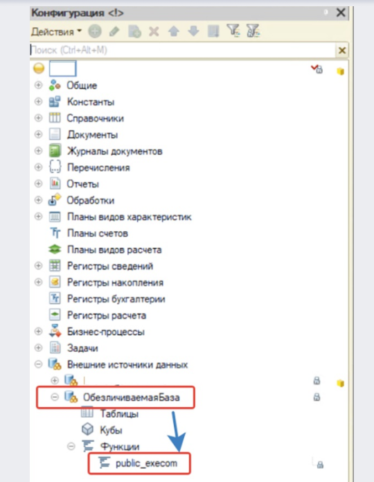 В основной конфигурации настраивается внешний источник данных с именем «ОбезличиваемаяБаза». Для этого необходимо переподключить функцию public_execom.