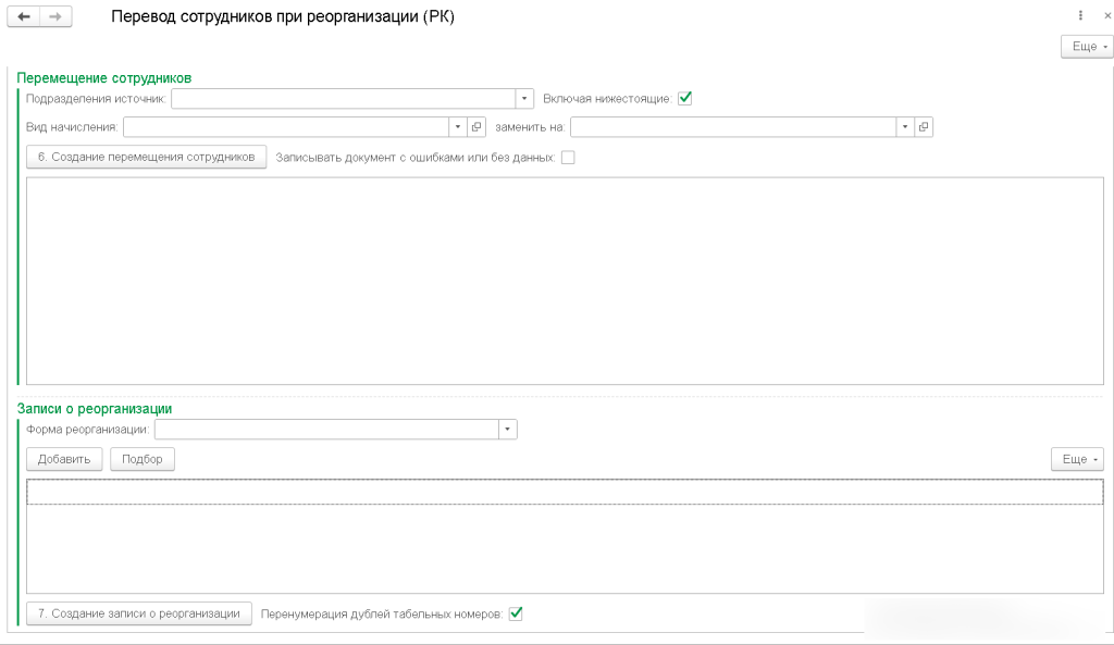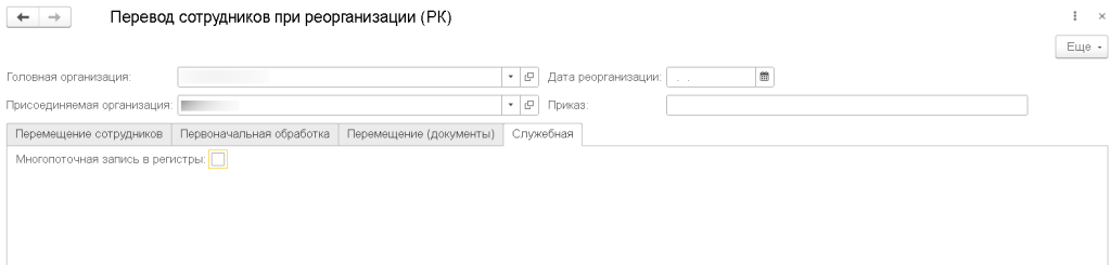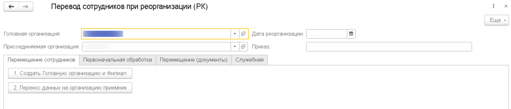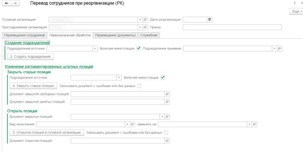 Теперь все изменилось. Достаточно выбрать присоединяемую организацию, запустить обработку и нажать кнопку дальнейшего выполнения. Данные переносятся автоматически, позиции закрываются и открываются, сотрудники переводятся, регистры обновляются.